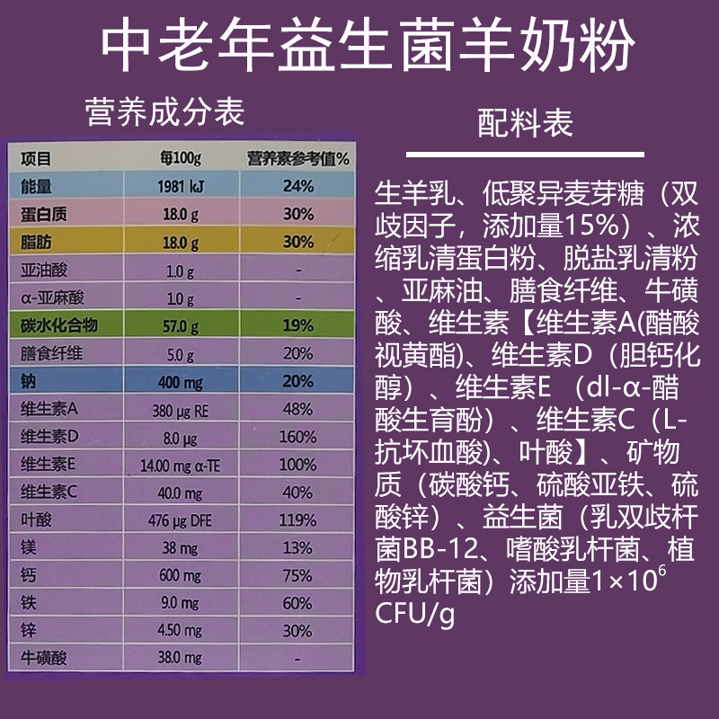 ÅäÁÏ±í£º ÉúÑòÈé¡¢µÍ¾ÛÒìÂóÑ¿ÌÇ£¨Ë«ÆçÒò×Ó£¬£¬£¬£¬£¬Ìí¼ÓÁ¿15%£©¡¢Å¨ËõÈéÇåÂѰ׷ۡ¢ÍÑÑÎÈéÇå·Û¡¢ÑÇÂéÓÍ¡¢ÉÅʳÏËά¡¢Å£»£»£»£»£»£»ÇËᡢάÉúËØ¡¾Î¬ÉúËØA(´×ËáÊÓ»Æõ¥)¡¢Î¬ÉúËØD£¨µ¨¸Æ»¯´¼£©¡¢Î¬ÉúËØE £¨dl-¦Á-´×ËáÉúÓý·Ó£©¡¢Î¬ÉúËØC£¨L-¿¹»µÑªËá)¡¢Ò¶Ëá¡¿¡¢¿óÎïÖÊ£¨Ì¼Ëá¸Æ¡¢ÁòËáÑÇÌú¡¢ÁòËáп£©¡¢ÒæÉú¾ú£¨ÈéË«Æç¸Ë¾úBB-12¡¢ÊÈËáÈé¸Ë¾ú¡¢Ö²ÎïÈé¸Ë¾ú£©Ìí¼ÓÁ¿1¡Á106CFU/g